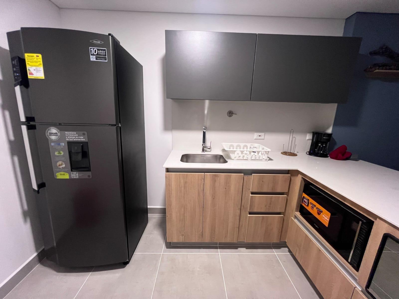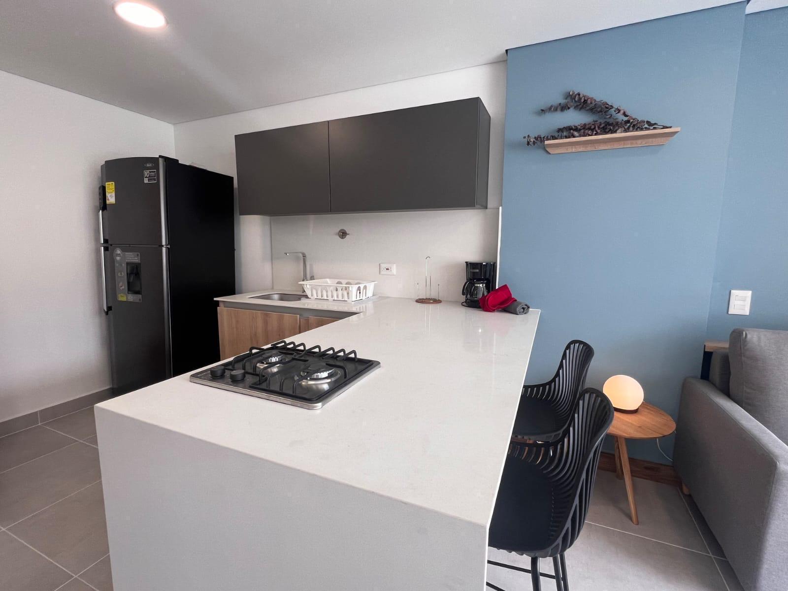El inmueble cuenta con 1 alcoba con baño privado y vestier, además de un espacio integrado de sala, comedor y estar, cocina abierta con barra tipo isla, zona de ropas independiente y acceso a balcón desde la habitación y la zona social, lo que brinda excelente iluminación natural y ventilación.